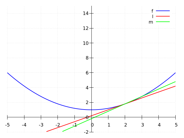 Benader de helling van de raaklijn #l# door de helling van lijn #m# te berekenen.