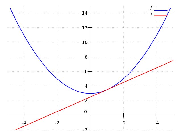 We conclude that the function rule of the tangent line looks like #l(x)=1 \cdot x +b#, where #b# is yet to be determined. We do so by using the fact that the tangent line moves through the point #\rv{1,{{7}\over{2}}} #. This means that #{{7}\over{2}}=1 \cdot 1 +b# and, hence, #b={{7}\over{2}}-1 = {{5}\over{2}}#.